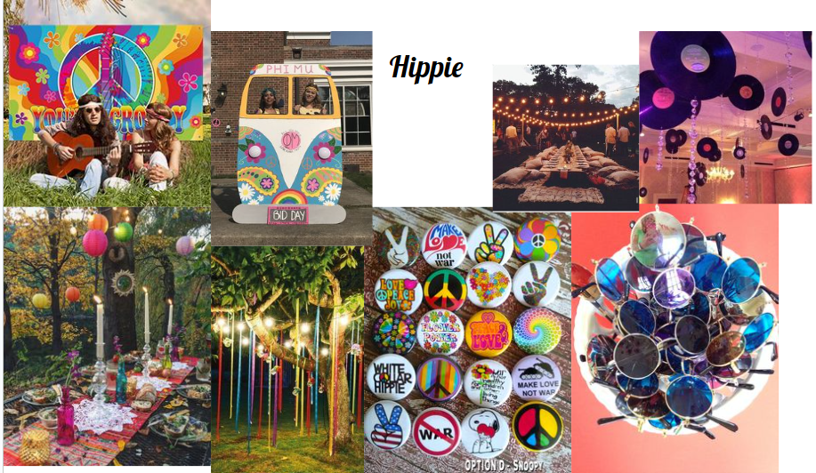 Färgglada kläder och blomsterkransar pryder huvudena när gästerna samlas för en nostalgisk resa tillbaka till 60-talets frihet och kärlek på en hippie fest.